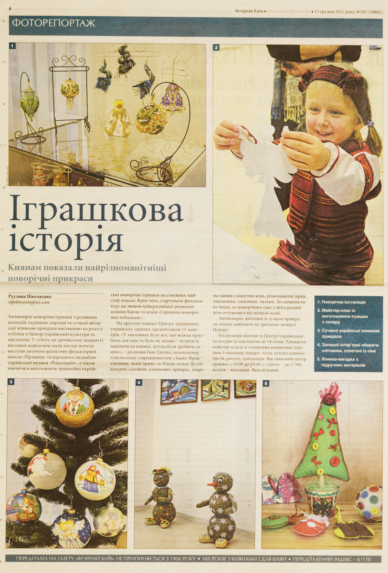 Антикварні новорічні іграшки з родинних колекцій українців, народні та сучасні авторські ялинкові прикраси виставлено в Центрі Української Культури та Мистецтва. У суботу на урочистому відкритті виставки відвідувачі мали нагоду почути виступи дитячого колективу фольклорної школи «Правиця» та народного ансамблю української музики «Роксоланія», а також навчилися виготовляти традиційні українські новорічні іграшки на сімейних майстер-класах. Крім того, стартував фотоконкурс на звання найкрасивішої родинної ялинки Києва та акція «Скринька Новорічних Побажань».