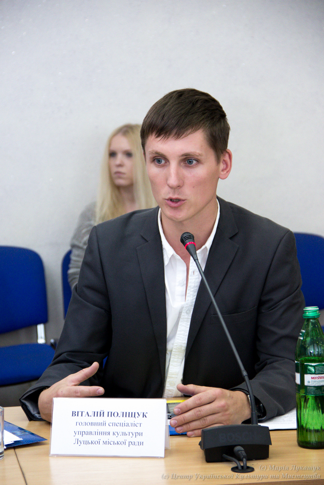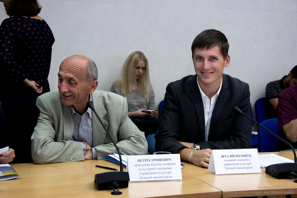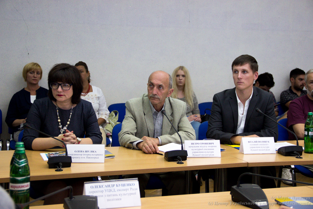 У круглому столі взяли участь: Тері Сандел, керівник Програми Східного партнерства «Культура»; Андрій Вітренко, заступник Міністра культури України з питань європейської інтеграції; Олександр Буценко, директор УЦКД, експерт Ради Європи з питань культурної політики; Світлана Долеско – Генеральний директор Центру Української Культури та Мистецтва; Олена Шуліка, координатор інтеркультурного проекту в м. Павлограді; Петро Троневич, начальник відділу охорони культурної спадщини управління культури Луцької міської ради; Віталій Поліщук, головний спеціаліст управління культури Луцької міської ради; Михайло Кубай, заступник директора з науково-реставраційної роботи ДІАЗ у м. Жовква.