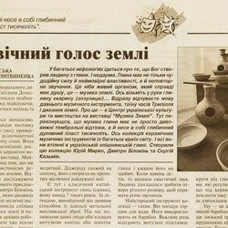 А все почалося випадково. Юрій Мирко відвідав виставку кераміки, де його увагу привернули світлини різноманітної глини у природному стані. Вона видалася йому красивішою, досконалішою за самі керамічні вироби, що були на виставці. Майстер замислився над тим, що ми поверхово використовуємо ресурси, даровані нам землею. Відтоді Юрій почав досліджувати глину. Згодом до нього приєдналися однодумці Дмитро Білокінь та Сергій Казьмін, яких цікавила музика та керамічні музичні інструменти. Так виникла спільна ідея поєднати звуки землі й повітря. Розпочалася архівна робота. Майстри шукали вже відомі музичні інструменти різних культур, досліджували інструменти з глини, а найцікавіше — створювали власні. Тож на виставці кожен експонат — своєрідна авторська робота. Під час відкриття вони організували імпровізований концерт на оригінальних інструментах, серед них — утар, шивайя, маракаси, дідже- ріду тощо.